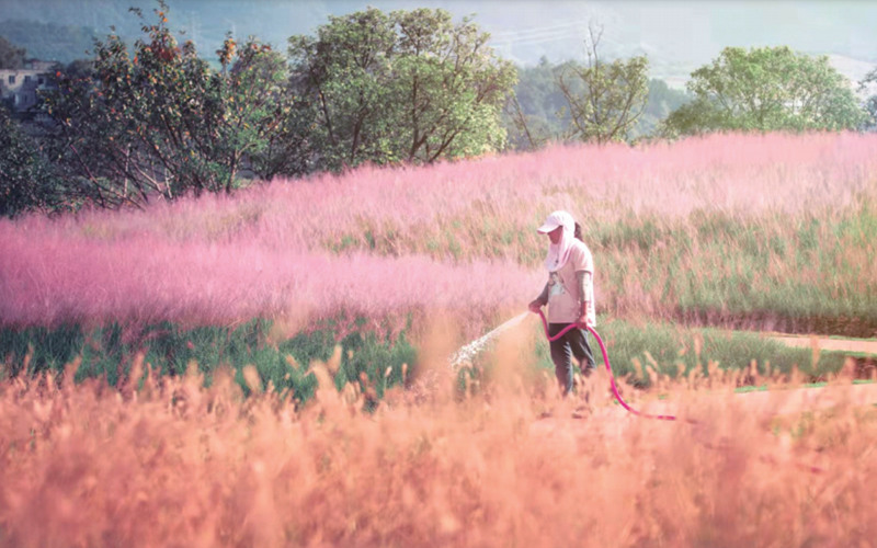 廣陽島生態(tài)修復工程啟動后,這里運用“理水、豐草”兩大策略,整理地形、改良土壤,引表蓄流,梳理生態(tài)草溝、匯水形成雨水花園,打造出連綿起伏、錯落有致的粉黛夢境和浪漫花田場景,成為探索巴渝農(nóng)田藝術化種植的綠色發(fā)展示范。