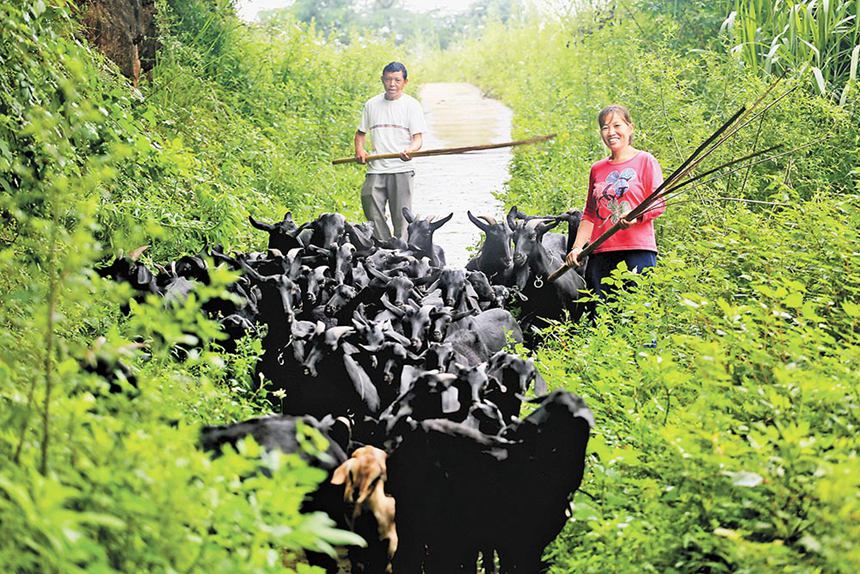大足區(qū)中敖鎮(zhèn)觀寺村,隆元友和妻子謝世英正在放養(yǎng)黑山羊。(本報資料圖片)通訊員 瞿波 攝\視覺重慶