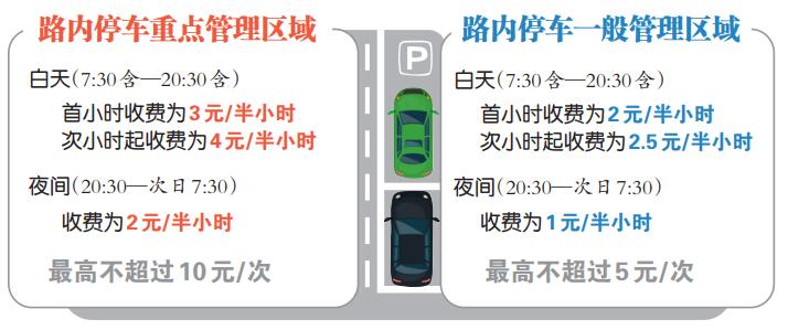 在路內(nèi)停車一般管理區(qū)域,白天(7:30含—20:30含)首小時收費為2.00元/半小時·泊位,次小時起收費為2.50元/半小時·泊位;夜間(20:30—次日7:30)收費為1.00元/半小時·泊位,最高不超過5.00元/次·泊位。
