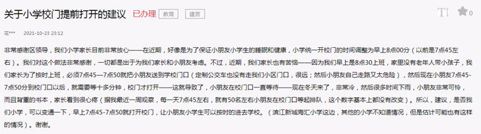 人民網(wǎng)重慶11月1日電 (陳琦、胡虹)“感謝江津區(qū)教委和學(xué)校領(lǐng)導(dǎo),女兒和其他同學(xué)可以‘提早’進(jìn)入校門,我們家長(zhǎng)也能按時(shí)去上班了!”近日,重慶市江津區(qū)一位家長(zhǎng)給人民網(wǎng)“領(lǐng)導(dǎo)留言板”反映,雙減政策下,為了保證小學(xué)生的睡眠和健康,女兒就讀的小學(xué)將早上開校門時(shí)間調(diào)整為8點(diǎn)(以前是7點(diǎn)45左右)。【留言原文鏈接】