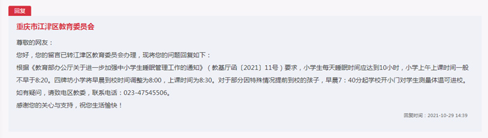 收到留言后,江津區(qū)教委回復(fù):根據(jù)《教育部辦公廳關(guān)于進(jìn)一步加強(qiáng)中小學(xué)生睡眠管理工作的通知》要求,小學(xué)生每天睡眠時(shí)間應(yīng)達(dá)到10小時(shí),小學(xué)上午上課時(shí)間一般不早于8點(diǎn)20。四牌坊小學(xué)將早晨到校時(shí)間調(diào)整為8點(diǎn),上課時(shí)間為8點(diǎn)30。