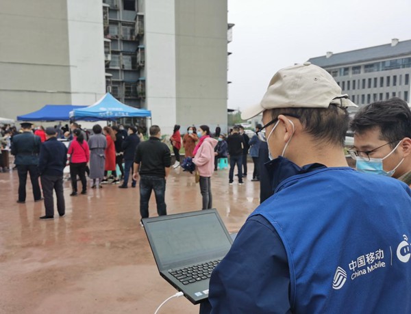 在長壽,重慶移動網(wǎng)絡(luò)優(yōu)化人員在集中核酸檢測點(diǎn)進(jìn)行網(wǎng)絡(luò)保障。重慶移動公司供圖