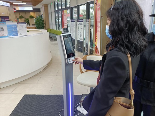 在高新區(qū)政務(wù)大廳,客戶正使用中國移動視頻云感測溫測碼一體機(jī)進(jìn)行測溫及人證比對。重慶移動公司供圖