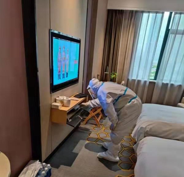 重慶移動網(wǎng)絡(luò)裝維人員做好全面防護(hù)為隔離酒店客戶進(jìn)行寬帶網(wǎng)絡(luò)電視調(diào)試。重慶移動公司供圖