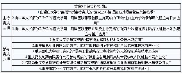 11月3日,國家科學技術獎勵大會在北京舉行。重慶共有9個科技項目獲得2020年度國家科學技術獎,包括國家技術發(fā)明獎二等獎3項、國家科技進步獎二等獎6項,其中主持完成的3項,參與完成的6項。