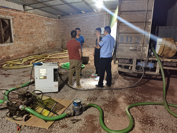 2021年5月,沙坪壩區(qū)公安分局民警通過零星的幾條線索巡線深挖,發(fā)現(xiàn)在回龍壩鎮(zhèn)有一銷售偽劣汽油的黑作坊。通過前期摸排與實地調(diào)查,5月20日,沙坪壩警方開展抓捕行動,當場抓獲涉嫌銷售偽劣汽油的犯罪嫌疑人劉某與李某,另一名嫌疑人伍某在逃,現(xiàn)場查獲偽劣92號汽油約40噸。