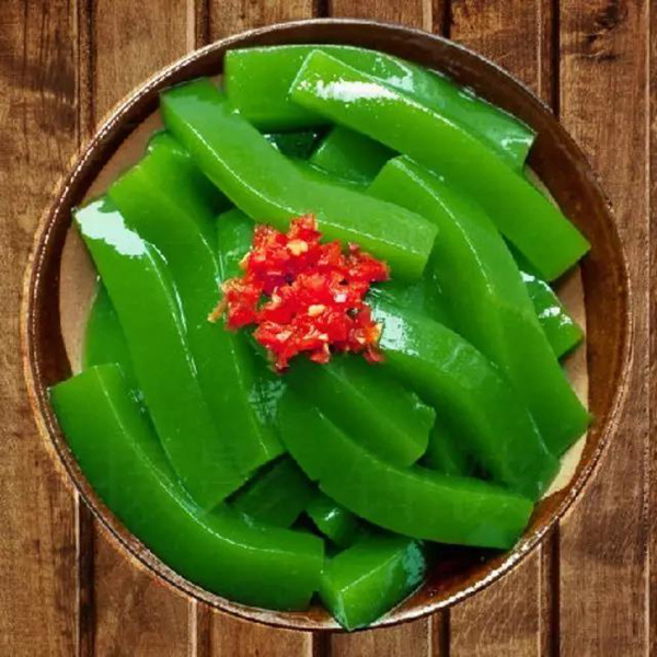 翡翠涼粉是巫山縣最具特色的傳統(tǒng)名小吃之一,是用野生腐婢的鮮葉采用傳統(tǒng)工藝精制而成。將腐婢鮮葉洗凈入木桶,淋入開水浸泡3分鐘,搗成糊狀過濾,用澄清柴灰水點(diǎn)入攪均冷卻即成涼粉,碧綠清香,色如翡翠,故稱之為翡翠涼粉。
