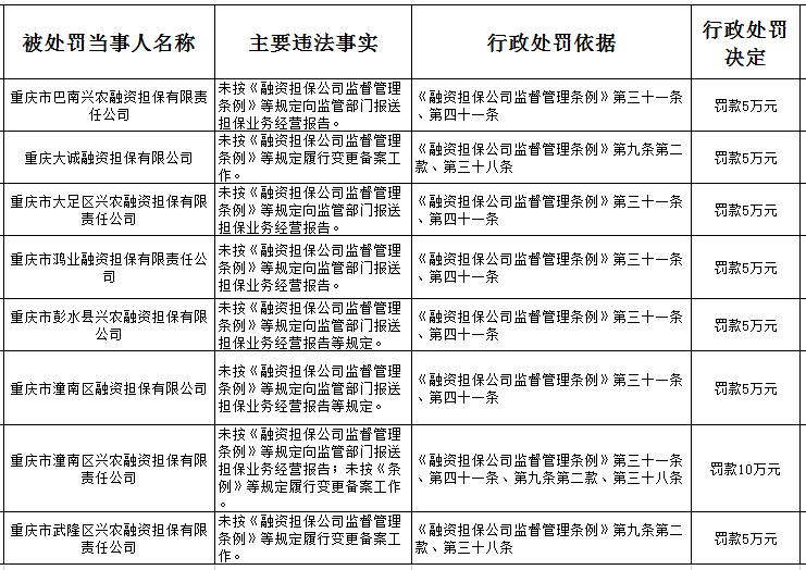 重慶市金融監(jiān)管局相關(guān)負(fù)責(zé)人表示,本次處罰的8家機(jī)構(gòu)主要存在未按照《融資擔(dān)保公司監(jiān)督管理?xiàng)l例》等行業(yè)監(jiān)管規(guī)定報(bào)送業(yè)務(wù)經(jīng)營(yíng)報(bào)告、履行股東或董監(jiān)高人員變更備案程序等違法行為。在行政處罰過(guò)程中,重慶市金融監(jiān)管局按照新《行政處罰法》規(guī)定,遵循公正、公開(kāi)的原則,嚴(yán)格履行立案、調(diào)查、審理、審議、告知等一系列法定程序,依法合規(guī)開(kāi)展行政處罰工作。