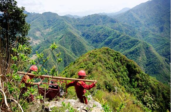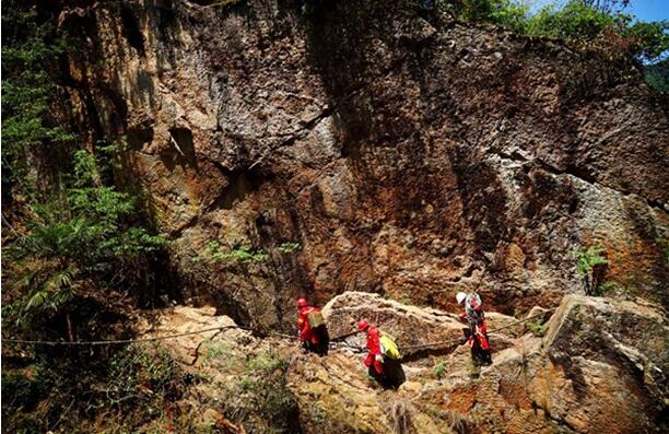 鉆井人員佩戴保險(xiǎn)繩在絕壁上運(yùn)送物資。西南物探分公司鉆井工程中心供圖