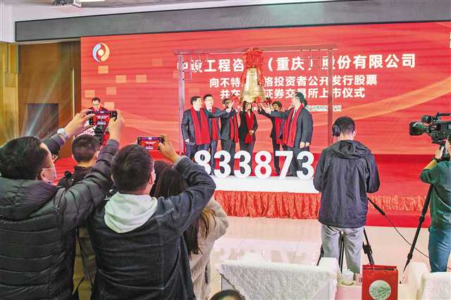 11月15日,江北區(qū)行政會(huì)議中心,該區(qū)重點(diǎn)企業(yè)中設(shè)工程咨詢(重慶)股份有限公司“云敲鐘”,正式登陸北京證券交易所。記者 崔力 攝/視覺重慶
