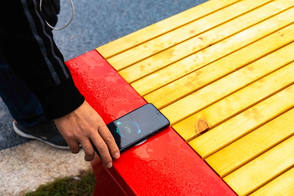 除此之外,公園內(nèi)各類(lèi)智慧設(shè)施也是隨處可見(jiàn),比如可充電、可上網(wǎng)的智慧座椅。市民可以直接通過(guò)USB接口為手機(jī)充電。如果沒(méi)帶數(shù)據(jù)線也沒(méi)關(guān)系,座椅兩端還有無(wú)線充電板,手機(jī)放在上面就可以直接充電。