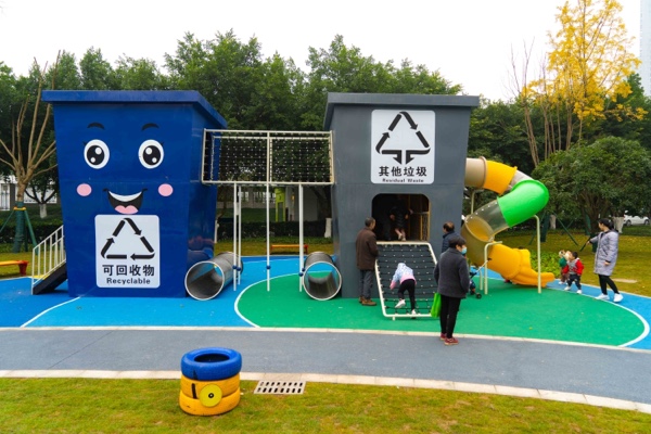公園內(nèi)設(shè)計(jì)了很多可供人們游玩的場(chǎng)景,如兩個(gè)巨大的分類(lèi)垃圾桶,內(nèi)部其實(shí)是小朋友攀爬的游樂(lè)場(chǎng),是最受小朋友喜愛(ài)的區(qū)域之一。