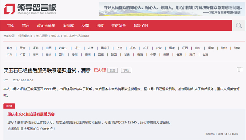 “留言后,重慶市文化和旅游發(fā)展委員十分重視,經(jīng)旅行社導(dǎo)游與店家溝通,售后服務(wù)承諾退貨退款。目前,退款已到賬。在此非常感謝,重慶火鍋美食好吃!”11月2日,該網(wǎng)友再次在人民網(wǎng)“領(lǐng)導(dǎo)留言板”留言,專門表示感謝。