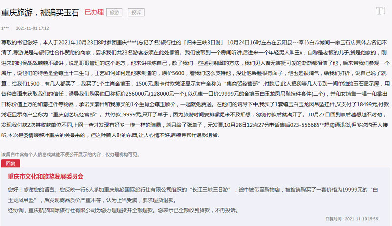 人民網(wǎng)重慶11月19日電 (陳琦)“我于上月參團重慶某旅行社組織的‘長江三峽三日游’期間,在云陽縣一家玉石店,被忽悠后花19999元購買了白玉龍鳳吊墜。因旅游時間緊促,來不及細想,匆匆付款后就離開了;氐郊液笤较朐讲粚牛敃r只給了收據(jù),無發(fā)票。撥打售后電話想溝通退貨,但多次均無人接聽。”近日,一名網(wǎng)友在人民網(wǎng)“領(lǐng)導(dǎo)留言板”投訴,其在三峽游玩期間,購買了價格虛高的玉石,希望相關(guān)部門能幫助其退貨。
