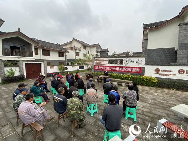 人民網(wǎng)重慶11月19日電 (劉政寧)“荒地變良田,柑橘一片黃,鄉(xiāng)村振興加油干,感謝黨恩照四方!11月19日,在重慶市渝北區(qū)大盛鎮(zhèn)青龍村太和場居民點(diǎn),63歲的楊三全帶領(lǐng)村民們學(xué)習(xí)黨的十九屆六中全會(huì)精神時(shí),以自己作詞的歌曲《綠水青山家鄉(xiāng)美》來收尾,并號(hào)召村民們今后繼續(xù)擼起袖子加油干,助力鄉(xiāng)村振興,把日子過得更紅火。