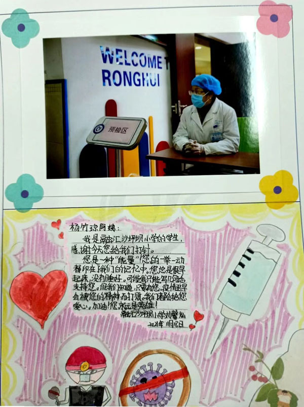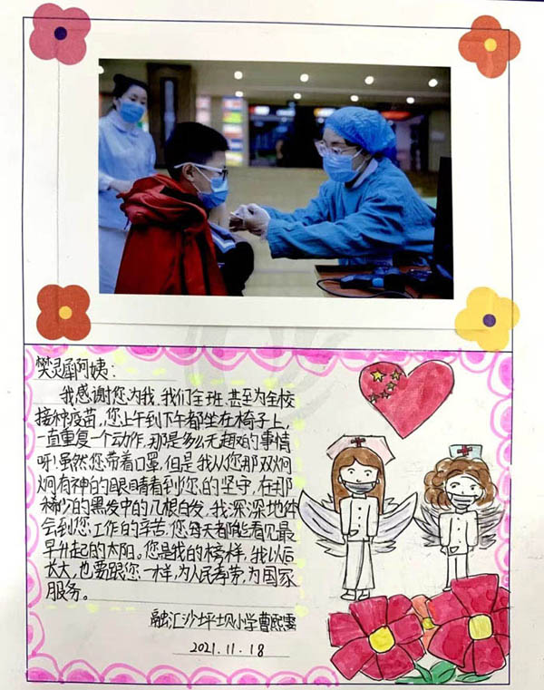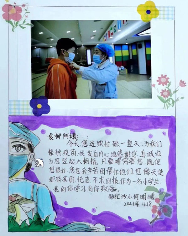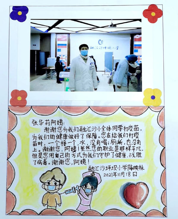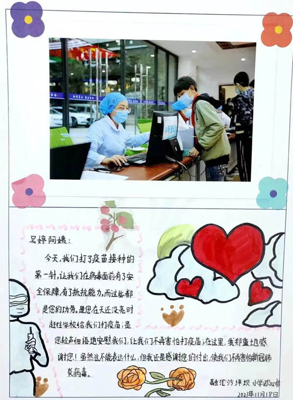 人民網(wǎng)重慶11月20日電 “是您,輕聲細語地安慰我們,讓我們不再害怕;您雖然做著平凡的工作,卻用自己的方式為我們守護了健康……”近日,重慶市沙坪壩區(qū)人民醫(yī)院的醫(yī)護人員走進融匯沙坪壩小學(xué),為孩子們接種新冠病毒滅活疫苗。忙了一天后,孩子們用充滿童趣的的方式表達了心中的愛和感恩。