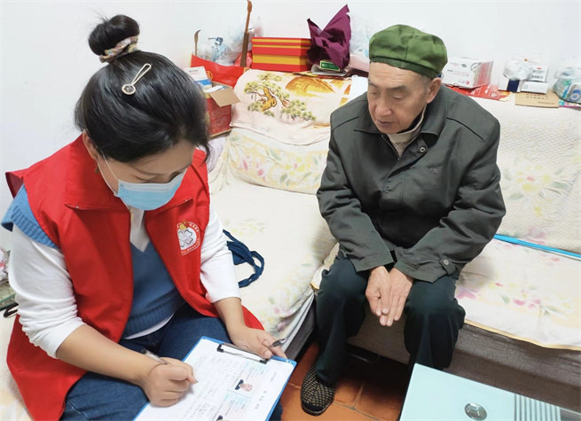 “彩虹橋”工作人員上門為王爺爺辦理業(yè)務(wù)。