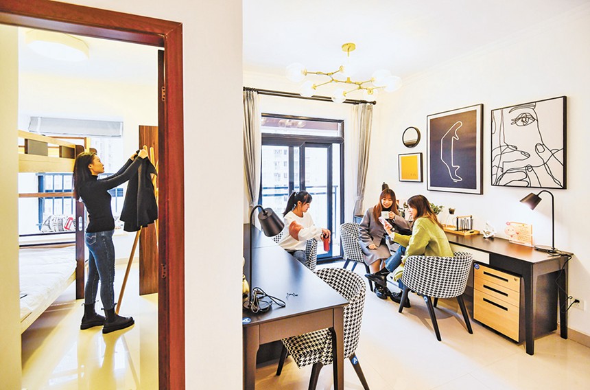 渝北區(qū)青年人才公寓,整潔溫馨的房間內(nèi),幾名入住青年正在交流。