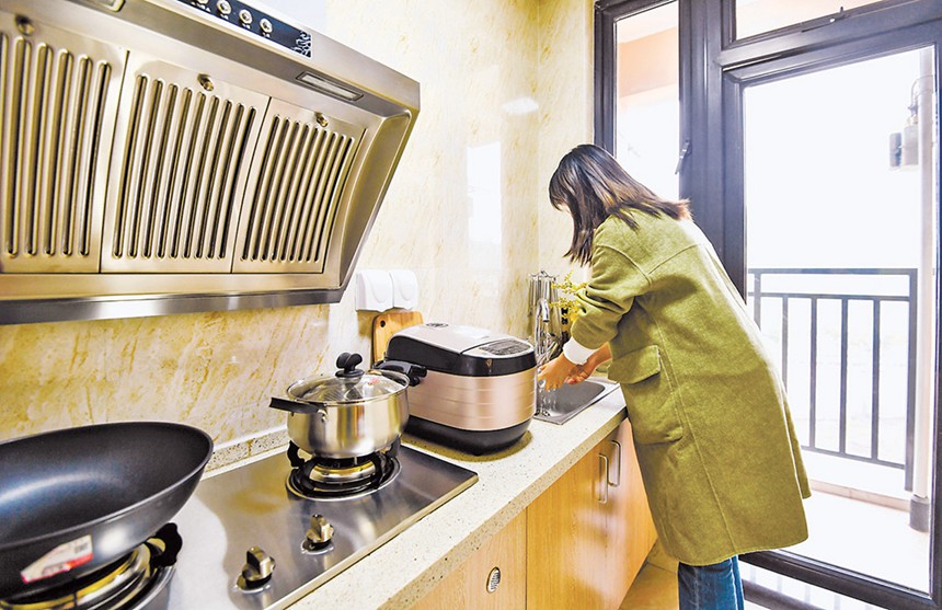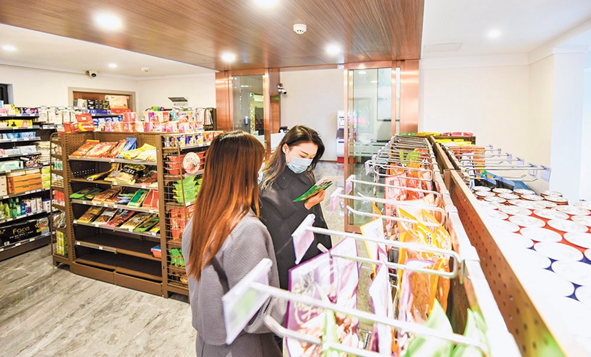 入住的青年正在公寓內(nèi)的超市購買商品。