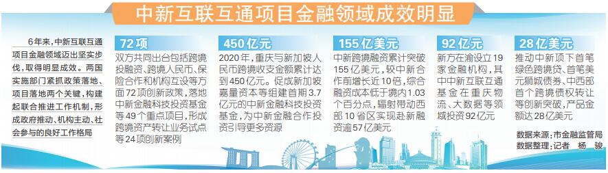 中新互聯(lián)互通項(xiàng)目落戶(hù)重慶6年來(lái),金融領(lǐng)域合作一直是中新雙方合作的重要內(nèi)容,且取得了顯著成效。