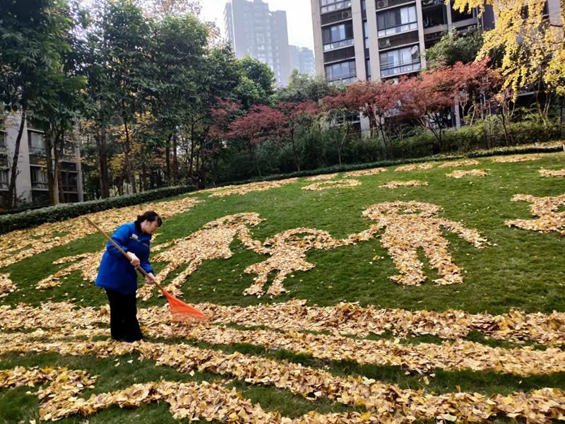 11月,又是一年杏葉黃的季節(jié),在不少社區(qū),落葉保潔是令物業(yè)頭疼的難題之一,“嘩嘩嘩”的笤帚聲,往往會(huì)是它們最終的歸宿。但在重慶龍湖水晶酈城的園區(qū),卻有這么一群人,他們雖不是畫(huà)家,但熱衷以秋葉“作畫(huà)”,擺出各種創(chuàng)意圖案,成為社區(qū)業(yè)主們爭(zhēng)相拍照、曬社交網(wǎng)絡(luò)的打卡點(diǎn),讓落葉在生命盡頭,為美好生活綻放最后的光輝。而這一葉、一畫(huà),轉(zhuǎn)眼便已成了堅(jiān)持了6年的傳統(tǒng)。