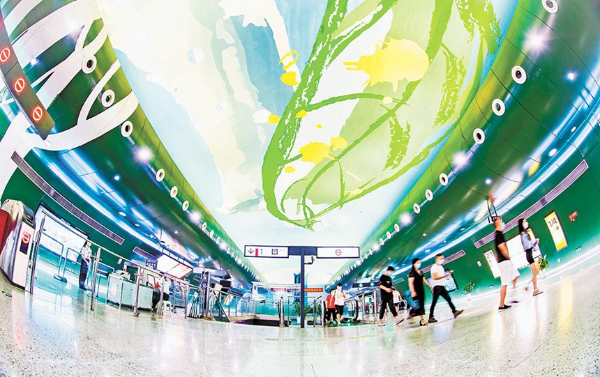 站內(nèi)的精心布置,加上站外的特色景觀,讓游客坐軌道交通時(shí),猶如坐上“時(shí)光穿梭機(jī)”,在重慶的現(xiàn)代和歷史中穿行。