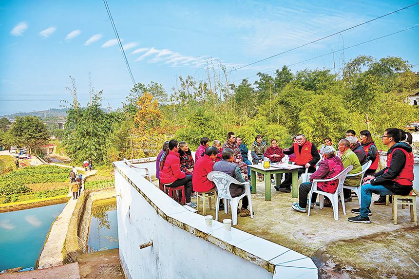 十一月二十六日,北碚區(qū)復(fù)興街道龍王村,宣講小分隊(duì)黨員譚其志(中)向村民宣講黨的十九屆六中全會(huì)精神。記者 萬(wàn)難 攝\視覺(jué)重慶