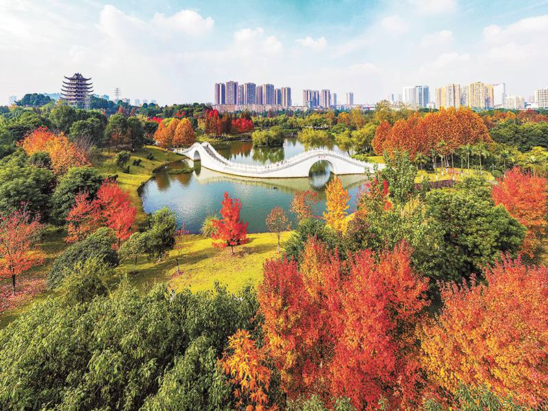這一點,不僅是城市園林建設(shè)堅持的原則,在大面積森林彩林的培育中,同樣也遵循鄉(xiāng)土樹種優(yōu)先。市林業(yè)局有關(guān)負(fù)責(zé)人介紹:“我們在國土綠化提升行動和’兩岸青山·千里林帶‘建設(shè)中,大量栽植了鵝掌楸、楓香、水杉等彩葉鄉(xiāng)土樹種,重要節(jié)點還適度栽植了銀杏、中山杉、三角梅等彩葉樹種!痹撠(fù)責(zé)人稱,在江河湖庫岸線、通道及道路沿線栽植的楓香、鵝掌楸、青杠、藍花楹、欒樹彩等彩色樹,如今已逐步形成了點狀、塊狀、線狀彩色森林。