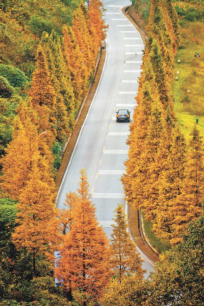 初冬時節(jié),綦江區(qū)古劍山風(fēng)景區(qū)旅游大道的水杉樹樹葉漸黃,散發(fā)出迷人的色彩。通訊員 陳星宇 攝/視覺重慶