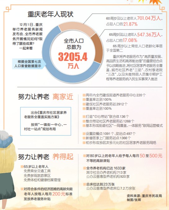 - 人民網(wǎng)重慶12月1日電 (胡虹、周小平、劉敏) 養(yǎng)老問(wèn)題已成為社會(huì)關(guān)注的熱點(diǎn)和焦點(diǎn),重慶養(yǎng)老服務(wù)狀況如何?12月1日,重慶市政府新聞辦召開(kāi)重慶市養(yǎng)老服務(wù)新聞發(fā)布會(huì),市民政局黨組書(shū)記、局長(zhǎng)唐步新介紹,重慶常住人口3205.4萬(wàn)人,60周歲以上常住老年人701.04萬(wàn)人,占比21.87%;65周歲以上常住老年人547.36萬(wàn)人,占比17.08%,65周歲以上常住人口老齡化率居于全國(guó)第二。 居家養(yǎng)老,既方便家人照看,又能讓老年人在熟悉的環(huán)境中生活,就近就地養(yǎng)老是眾老所盼。…