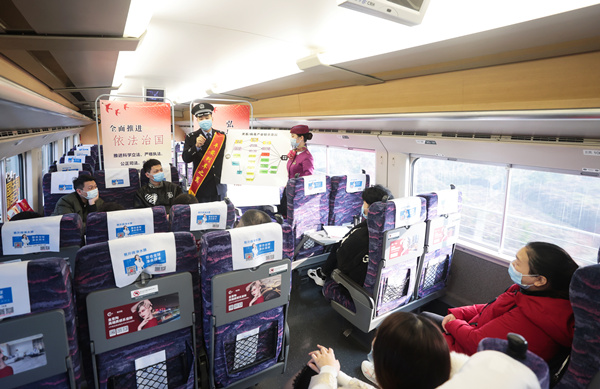 12月3日,重慶鐵路公安處民警在列車上為旅客進行法制宣傳。重慶鐵路公安處供圖