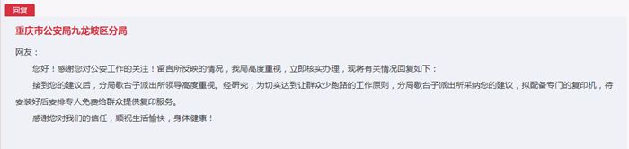 網(wǎng)友給重慶市市長(zhǎng)留言獲回復(fù):派出所將提供免費(fèi)復(fù)印