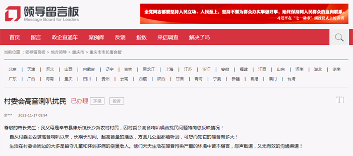 人民網(wǎng)重慶12月8日電 (陳琦)近日,一名網(wǎng)友在人民網(wǎng)“領(lǐng)導(dǎo)留言板”反映,農(nóng)村老家“村村響”廣播每天輪番播放噪音擾民,影響家中老人正常休息。針對反映的問題,重慶市奉節(jié)縣康樂鎮(zhèn)回復(fù),已結(jié)合實(shí)際,盡量減少播放頻次并降低音量。