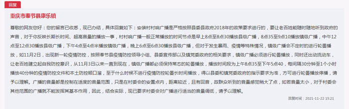 針對留言,重慶市奉節(jié)縣康樂鎮(zhèn)回復(fù)稱,安裝“村村響”廣播是要讓老百姓能隨時(shí)隨地聽到相關(guān)信息發(fā)布!按宕屙憽睆V播一般正常播放的時(shí)間節(jié)點(diǎn)是早上8點(diǎn)至8點(diǎn)30播放縣級廣播,8點(diǎn)35至9點(diǎn)10播放鎮(zhèn)級廣播,中午12點(diǎn)至12點(diǎn)30播放縣級廣播,下午4點(diǎn)至4點(diǎn)半播放鎮(zhèn)級廣播,晚上6點(diǎn)至6點(diǎn)30播放縣級廣播。