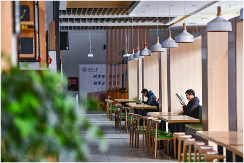上自習,不一定去圖書館,也不一定去書屋,在食堂也可以!重慶大學在滿足師生高品位多樣性的就餐需求基礎(chǔ)上,校區(qū)5個食堂充分利用食堂空間打造除教室和圖書館外的“育人第三空間”。規(guī)劃自習區(qū)、研討區(qū)、創(chuàng)意空間區(qū)、休閑交流區(qū)及學生活動區(qū),滿足學生就餐之外學習、交流、會議、研討等需求。