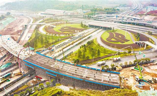12月9日,西部(重慶)科學(xué)城,科學(xué)大道一期青龍咀立交輔道橋施工現(xiàn)場,工人正在東輔道橋進(jìn)行混凝土澆筑。