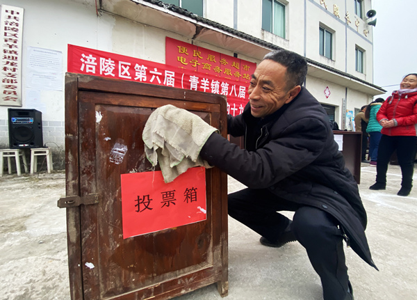 人民網(wǎng)重慶12月11日電 12月10日,是涪陵區(qū)第六屆人大代表選舉的日子。早上8點(diǎn)多鐘,涪陵區(qū)青羊鎮(zhèn)迎龍村投票站現(xiàn)場(chǎng),迎龍村黨支部副書記楊永貴認(rèn)真地用毛巾擦拭投票箱,為投票做準(zhǔn)備。