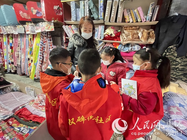 小朋友們走進(jìn)商戶宣傳垃圾分類知識(shí)。人民網(wǎng) 胡虹攝