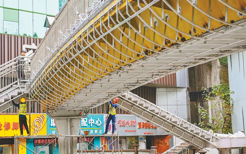 12月14日,渝中區(qū)中山一路,工人正在人行天橋安裝支架。