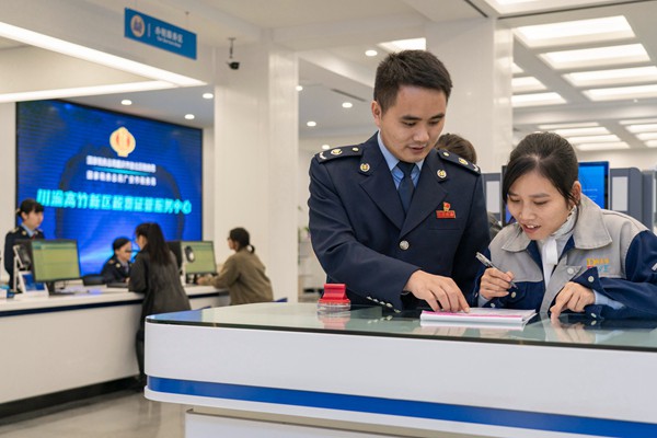 在川渝高竹新區(qū)稅費(fèi)征管服務(wù)中心導(dǎo)稅區(qū),稅務(wù)人員正輔導(dǎo)辦理涉稅事項(xiàng)。郭睿攝