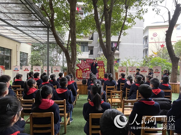 “紅巖小導(dǎo)游”在重慶市沙坪壩區(qū)四川外國語大學附屬小學映山紅故事苑講紅色故事。人民網(wǎng) 胡虹攝