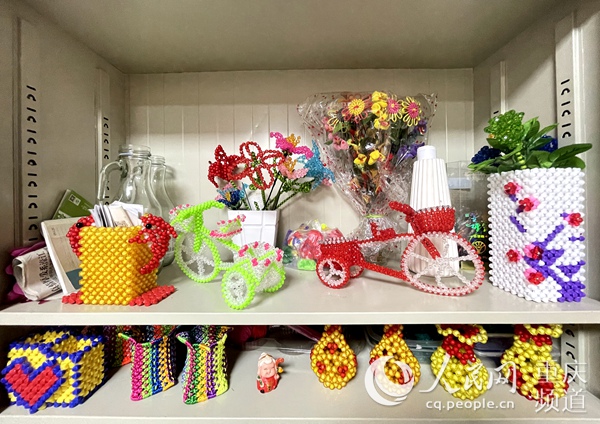 展示架上擺著殘疾人做的串珠手工藝品。人民網(wǎng) 胡虹攝