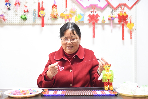 “紅燈籠、小金魚、鑰匙扣、十二生肖……這些都是我們賣得最火的!碧锕鹛m指著墻上掛著的串珠作品,自豪地介紹著,“每次賣完,我們都要趕著再做一批出來。”