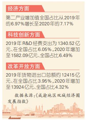 12月21日,重慶工商大學(xué)成渝地區(qū)雙城經(jīng)濟(jì)圈協(xié)調(diào)發(fā)展中心首次發(fā)布《成渝地區(qū)雙城經(jīng)濟(jì)圈發(fā)展指數(shù)》(以下簡(jiǎn)稱《指數(shù)》)。數(shù)據(jù)顯示,2020年,重慶和四川的經(jīng)濟(jì)總量、在全國(guó)占比分別從2019年的69969.6億元、7.12%提升至73601.6億元、7.27%,發(fā)展勢(shì)頭良好,“兩中心、兩高地”正逐漸形成。