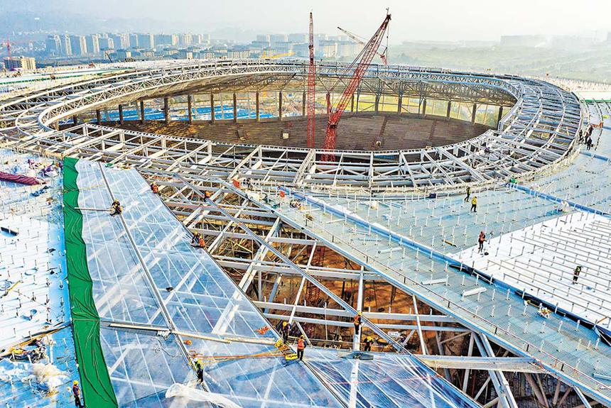 12月21日,重慶龍興足球場(chǎng)施工現(xiàn)場(chǎng),工人們正在進(jìn)行金屬屋面及幕墻裝飾施工,為足球場(chǎng)穿上“外衣”。