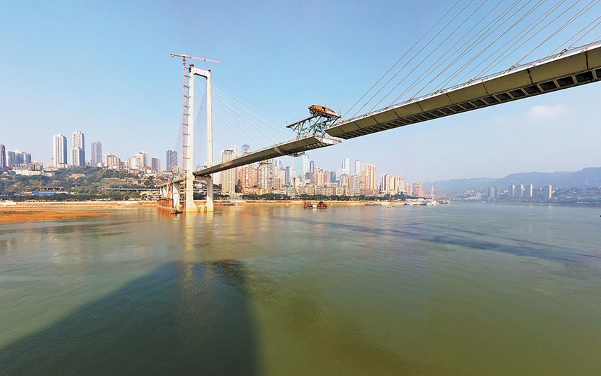 南紀門長江軌道專用橋是軌道10號線二期工程的關(guān)鍵控制工程,全橋總長1224米、寬20米,共設(shè)9個墩臺,為五跨高低塔雙索面斜拉橋。專用橋建成后將有效分流軌道3號線南北向客流,緩解渝中半島與江北、南岸間的跨江交通壓力,完善城市軌道交通線網(wǎng)格局。