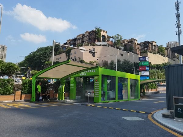 玥湖路充換電綜合服務站環(huán)保洗車區(qū)域。張艷攝