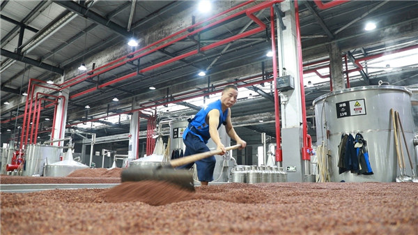 車間里一片火熱的景象,泡糧蒸煮、培菌糖化、入窖發(fā)酵、蒸餾出酒,三五人一組,各司其職,環(huán)環(huán)相扣,“一個車間兩班倒,一個班就有一百七十來號人,許多酒廠的規(guī)模都比不上我們一個車間!