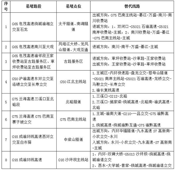 易擁堵路段及繞行線路。重慶高速集團(tuán)供圖