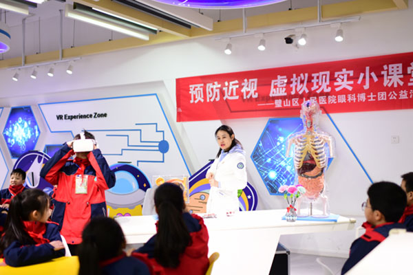 課堂上,璧山區(qū)人民醫(yī)院眼科博士團通過“虛擬現(xiàn)實VR技術(shù)”介紹了雙眼視覺基礎、調(diào)節(jié)與近視的關系、讓孩子感知雙眼單視帶來的立體視覺的感受,并讓孩子們近距離體驗“虛擬現(xiàn)實+醫(yī)療”的神奇魅力,讓孩子們認識到預防近視的重要意義。